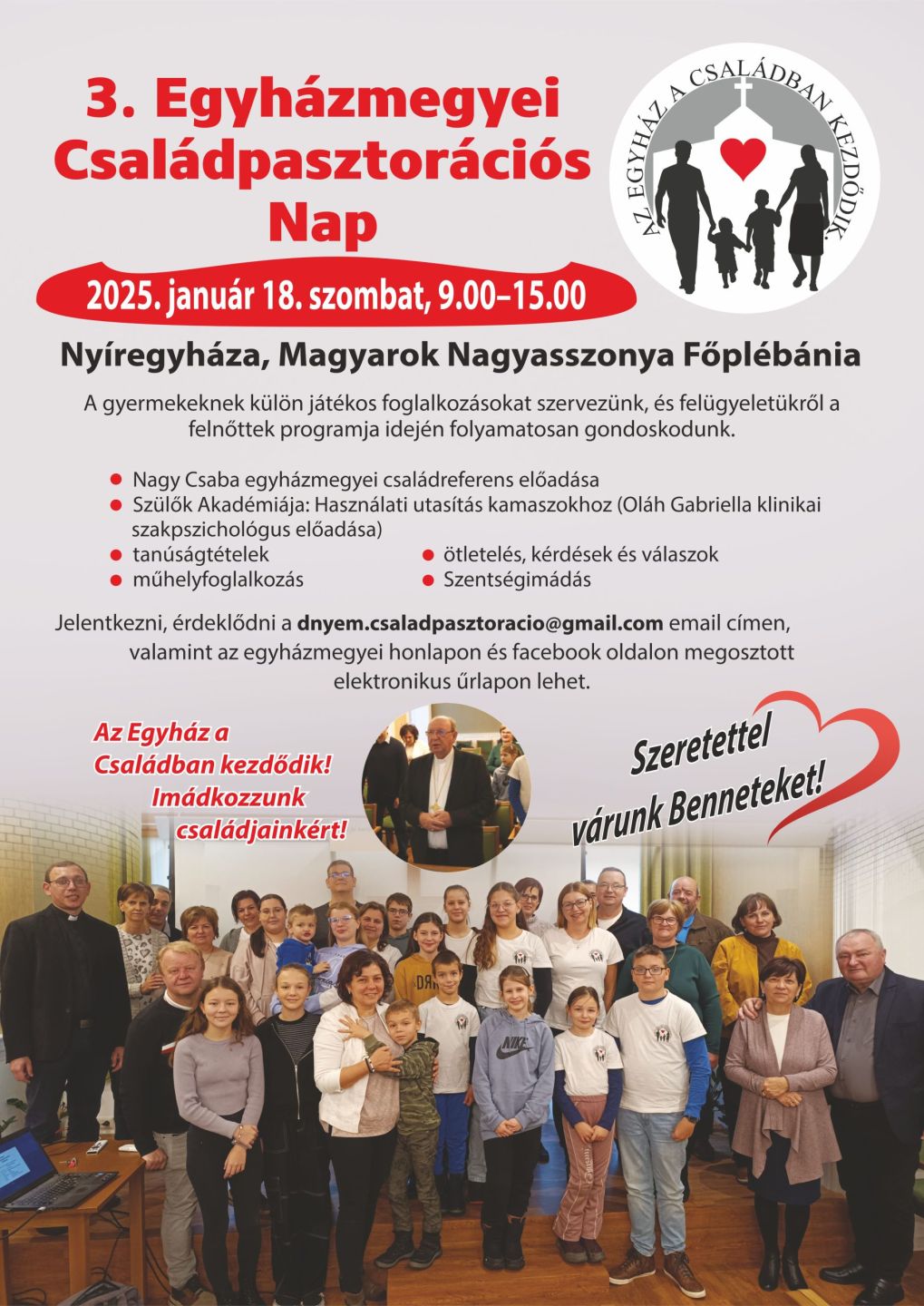 Nagy Csaba plébános, egyházmegyei családreferens és munkatársai várják az érdeklődő családokat és a családpasztorációs tevékenységben segíteni vágyó fiatalokat.