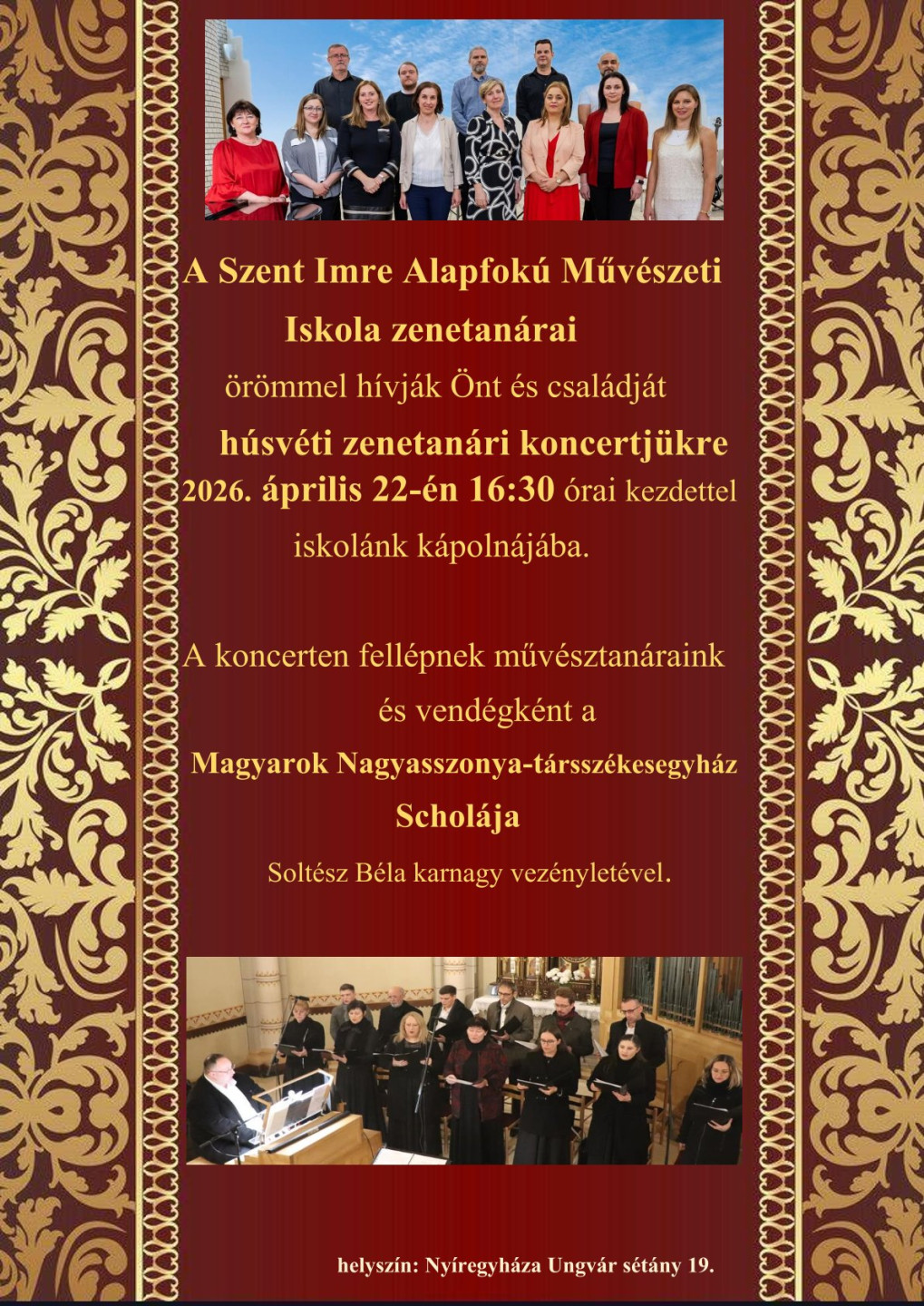 A zenetanárok és a Schola tagjai közös koncertre hívják az érdeklődőket a Szent Imre Gimnázium kápolnájába. Az alkalmon a közösség tagjai együtt muzsikálnak, és változatos zenei műsorral készülnek ...