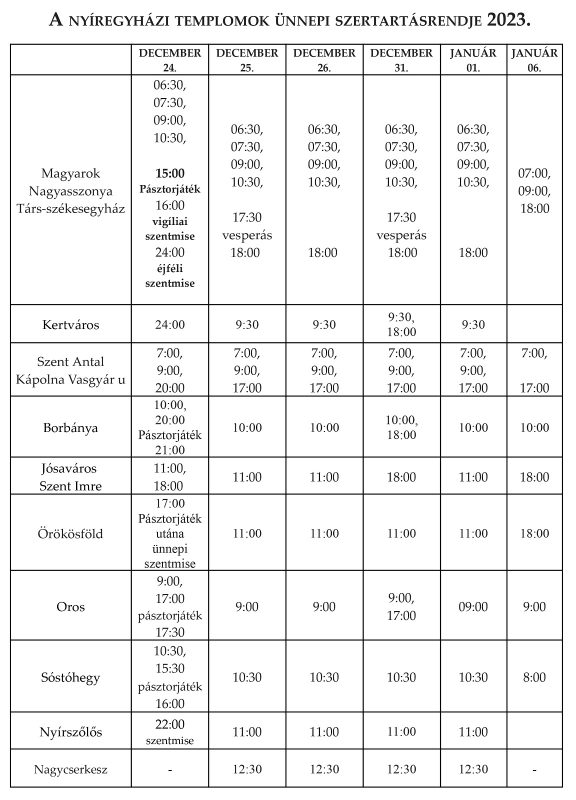 A Nyíregyházi templomok ünnepi szertartásrend 2023