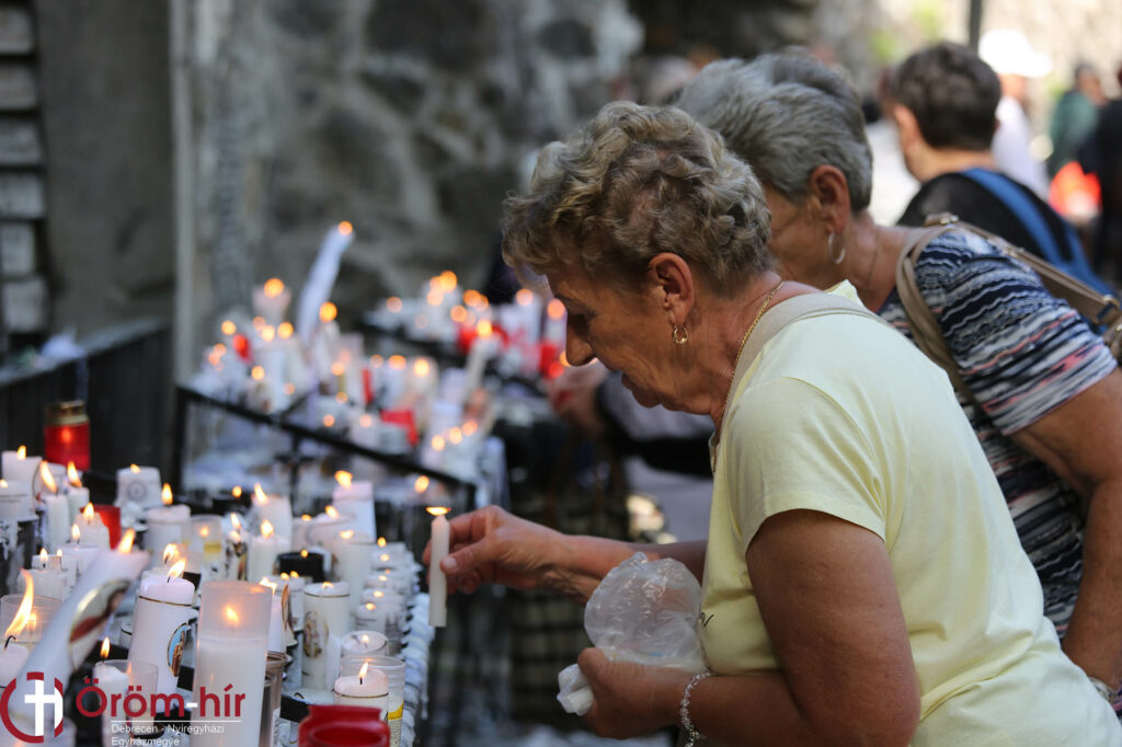 Édesanyánk, aki a magas mennyekből gondot visel ránk – énekelték a hívek, miközben a menet bevonult a szabadtéri oltár elé, majd utánuk a rengeteg pap, akik a zarándokokkal érkeztek. A Sacerdos et Pontifex kezdetű énekkel köszöntötték Palánki Ferenc debrecen-nyíregyházi megyéspüspököt.