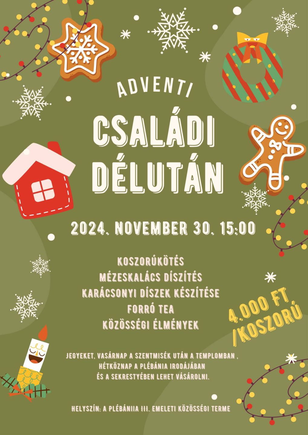 Adventi családi délutánt szervezünk a plébánián november 30-án, szombaton, 15:00 órától, ahol közösen koszorút kötünk, mézeskalácsot sütünk, és gipsz karácsonyfadíszeket készítünk. Az adventi koszorú kellékeinek beszerzése miatt a programon való részvétel előzetes regisztrációhoz kötött. Jelentkezni a plébániai irodában vagy a misék után a sekrestye előtti asztalnál lehetséges az alapanyag költségeihez történő, koszorúnkénti 4.000 Ft hozzájárulás megfizetésével.