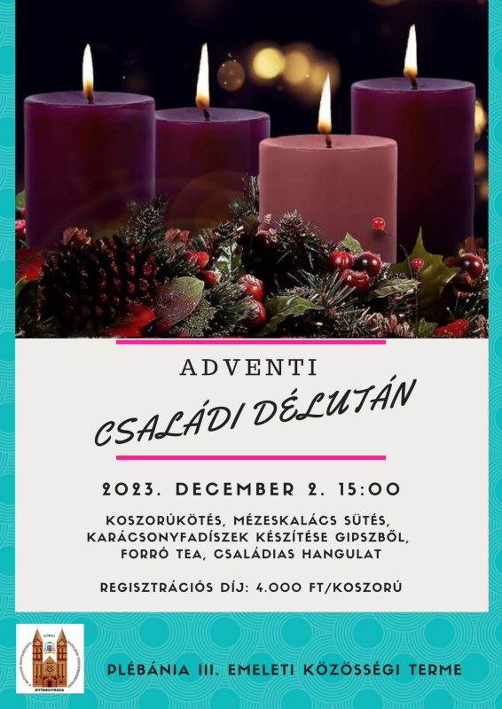 Adventi családi délutánt szervezünk a plébánia III. emeleti közösségi termében December 2-án, szombaton, 15:00 órától, ahol közösen koszorút kötünk, mézeskalácsot sütünk, és gipsz karácsonyfadíszeket festünk. Az adventi koszorú kellékeinek beszerzése miatt a programon való részvétel előzetes regisztrációhoz kötött. Jelentkezni hétköznap az irodában (9:00-16:30), vasárnap pedig a szentmisék után a sekrestyében lehet. Regisztrációs díj: 4.000 Ft/koszorú.