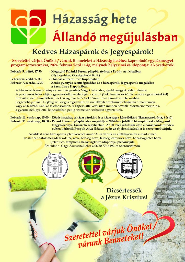 Február 11-én, 15:00-órától közös imádságra hívják a házaspárokat és a házasságra készülőket Nyíregyházán (Sóstón), a Házaspárok útján, este 18.00 órától pedig Palánki Ferenc megyéspüspök megáldja a 2024-ben jubiláló házaspárokat a nyíregyházi Magyarok Nagyasszonya-társszékesegyházban.