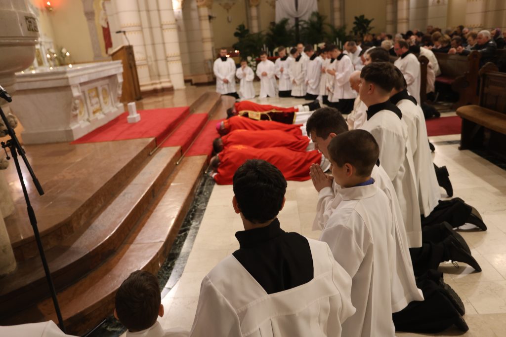 A szertartás kezdetén a papok piros miseruhában, némán vonultak az oltárhoz a ministránsokkal, majd leborultak az oltár előtt. A papok földre borulása az önmagát kiüresítő, az emberrel, a földdel azonosuló Krisztust jeleníti meg. Az oltár most maga a Golgota.