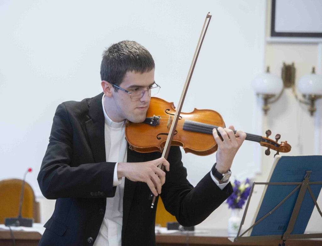 A könyvbemutató meghitt előadással kezdődött, a papszentelés előtt álló Csapó Márton, egyházmegyénk egyik diakónusa hegedű előadásával köszöntötte a gyémántmisés Nándor püspök atyát. Ezt követően pedig dr. Krakomperger Zoltán atya ismertette a két kiadványt.