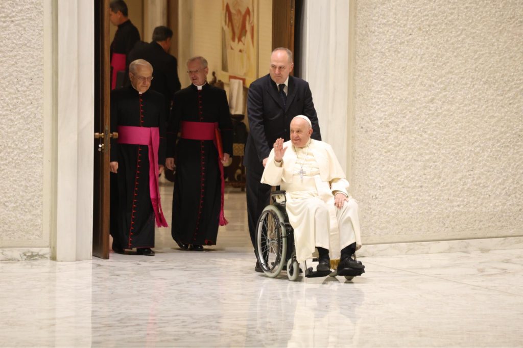 A pápa megérkezve a terembe beszédet mondott a zarándokok előtt; szavait Vértesaljai László SJ, a Vatikáni Rádió magyar szerkesztőségének vezetője tolmácsolta.
