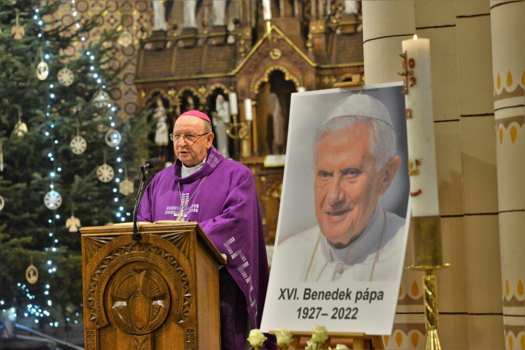 Január 5-én, csütörtökön, a 18 órakor bemutatott szentmisén egyházmegyénk papjai és hívei közösen adtunk hálát XVI. Benedek pápa gazdag életútjáért, és imádkoztunk lelki üdvöségéért. A szentmisét Palánki Ferenc megyéspüspök mutatta be, egyházmegyénk számos papjával.