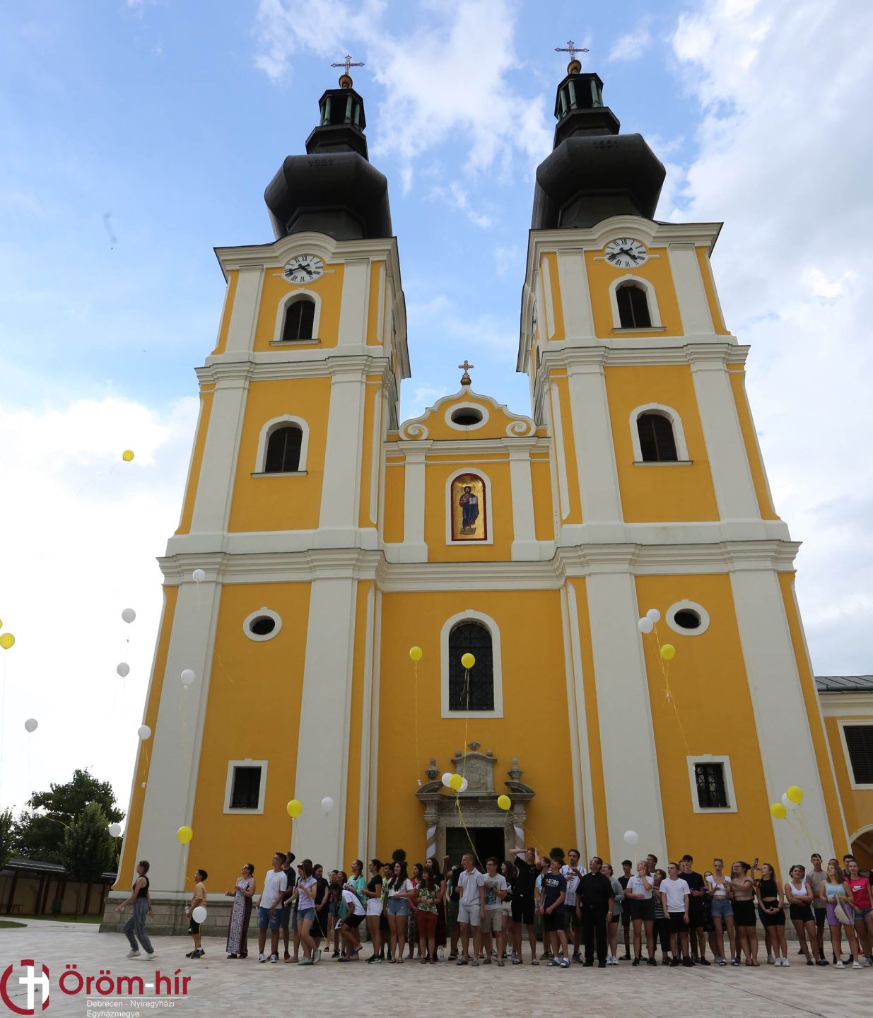 Délután Lengyel József atya érkezett a fiatalokhoz és 30 lufit engedtek fel együtt a kegytemplom előtt, megköszönve a Jóistennek a 30 éves egyházmegyét. A fiatalok hálatelt szavaikat papírra vetve, rákötötték a lufikra, és így engedték fel Istennek a magasba a köszönetüket és szeretetüket.