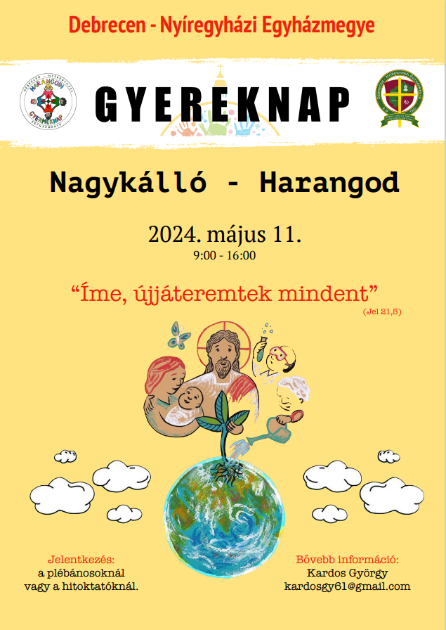 Az Egyházmegyei Gyermeknapot a hagyomány szerint a dombos, erdős, ligetes tájon, Nagykálló-Harangodon tartják 2024. május 11-én 9:00- 16:00-ig. Jelentkezni a plébánosoknál, vagy a hitoktatóknál lehet, bővebb információ kérhető: Kardos György főszervezőtől: kardosgy.61@gmail.com