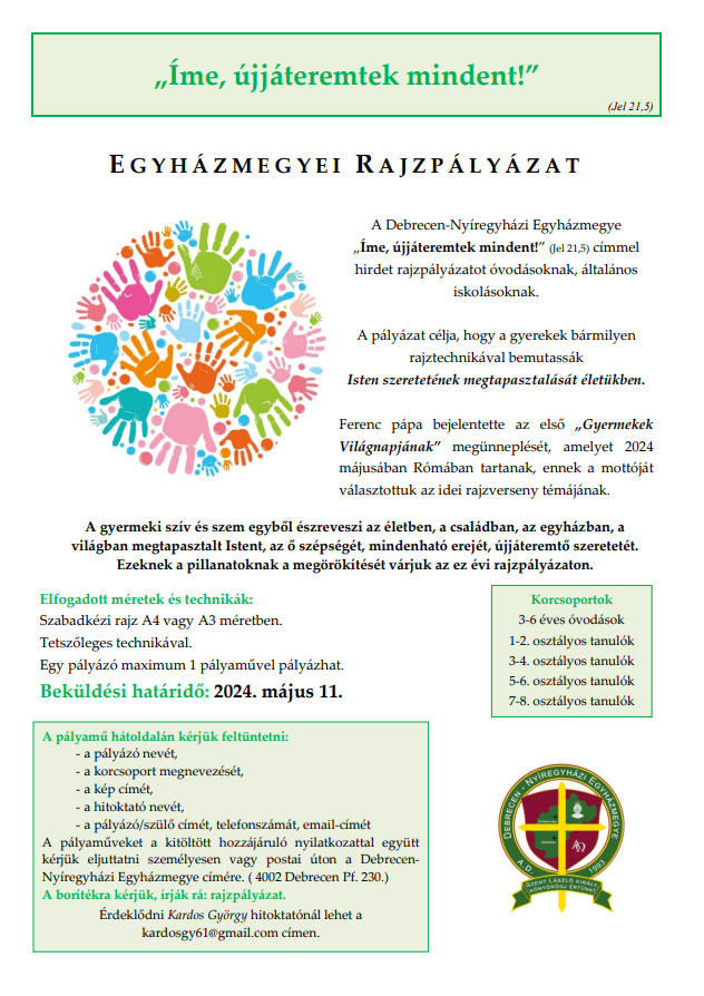 „Íme, újjáteremtek mindent!” (Jel 21,5). Ez a mottója a Ferenc pápa által meghirdetett Gyermekek Világnapjának, amelyet első alkalommal 2024. május 25-26-án tartanak Rómában. A Debrecen-Nyíregyházi Egyházmegye idei gyermeknapi rendezvénye és az egyházmegyei rajzverseny az „Íme, újjáteremtek mindent!” (Jel 21,5) mottóval csatlakozik a világnap üzenetéhez.