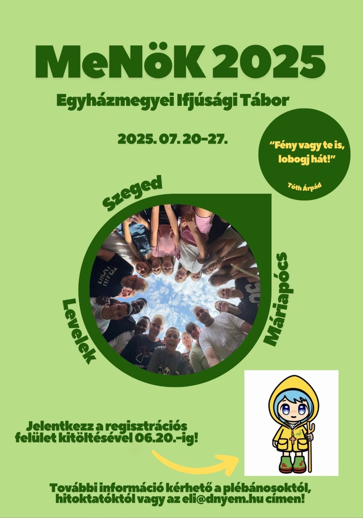 Az űrlap kitöltésével regisztráltok a Debreceni-Nyíregyházi Egyházmegye ifjúsági táborába, amelyet 2025. július 20-27. között rendezünk meg. A tábor első fele ismét Szegeden lesz, a Domaszék-Zöldfás Lelkigyakorlatos Központban (tavaly nagyon jól éreztük magunkat ott), majd Leveleken folytatjuk és a szokásoknak megfelelően Máriapócson zárjuk együttlétünket.