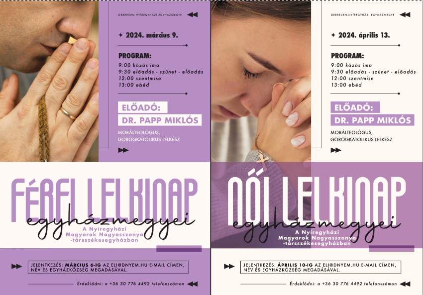 A Debrecen-Nyíregyházi Egyházmegye ismét megrendezi a népszerű női és férfi lelkinapot Nyíregyházán, a Magyarok Nagyasszonya-társszékesegyházban. A férfi lelkinap március 9-én, a női lelkinap április 13-án lesz. A lelkinapokat Dr. Papp Miklós morálteológus, görögkatolikus lelkész tartja.