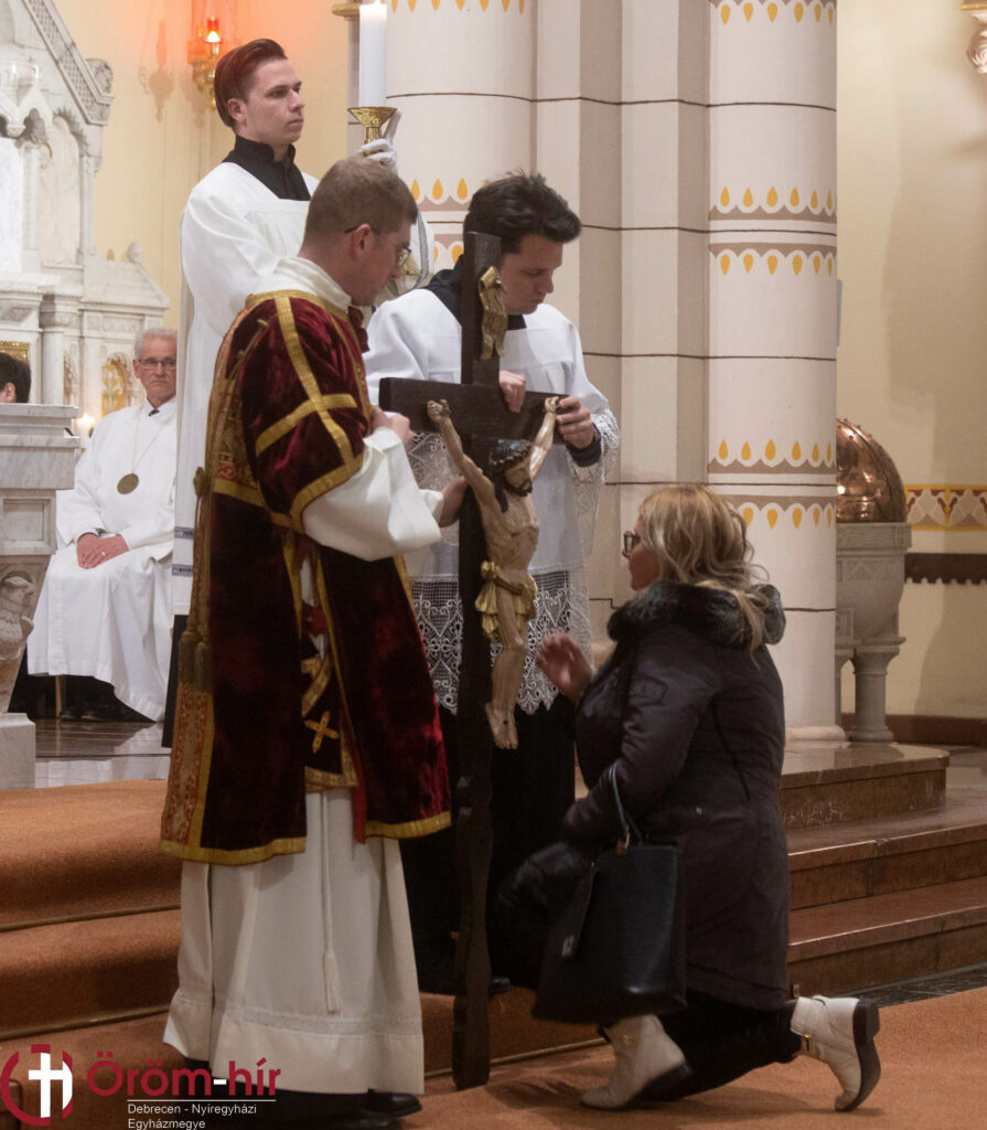 Ezután a főpásztor a feketevasárnapon (nagyböjt 5. vasárnapján) letakart keresztről levette a leplet, és a hívek térdhajtással, csókkal hódoltak a feszület előtt. A kereszthódolatban az Anyaszentegyház Isten végtelen szeretetéért, megbocsátásáért, a megtérésért ad hálát. Ő az, aki ma is él, ma is szenved az Egyházáért.