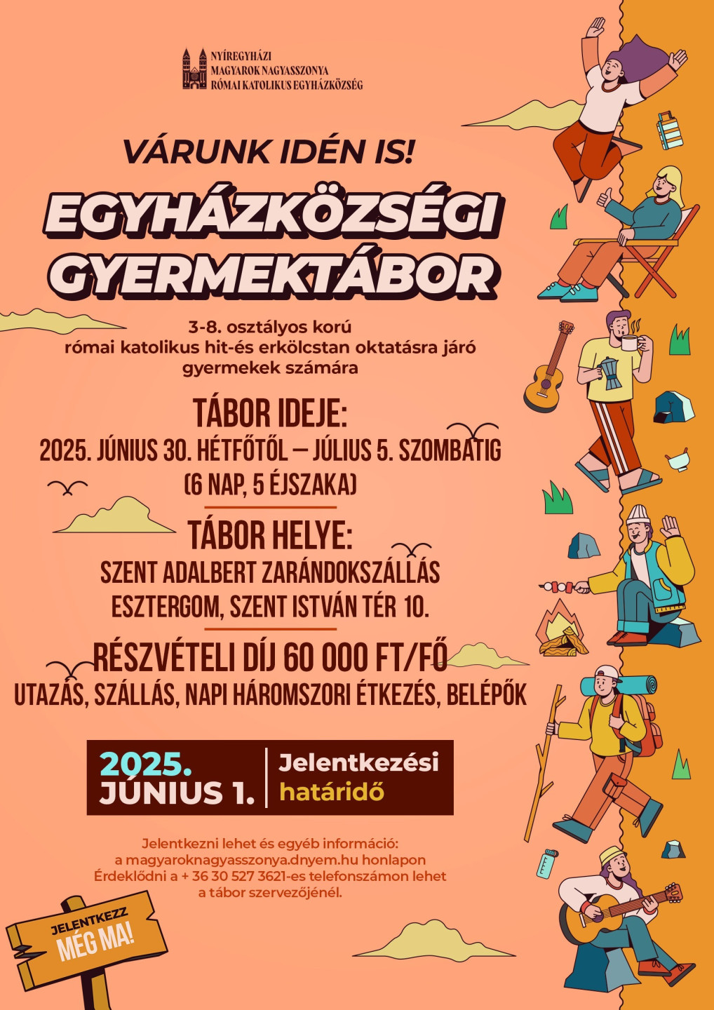 A Nyíregyházi Magyarok Nagyasszonya Római Katolikus Egyházközség nyári tábort szervez 3-8. osztályos korú római katolikus hit-és erkölcstan oktatásra járó gyermekek számára.