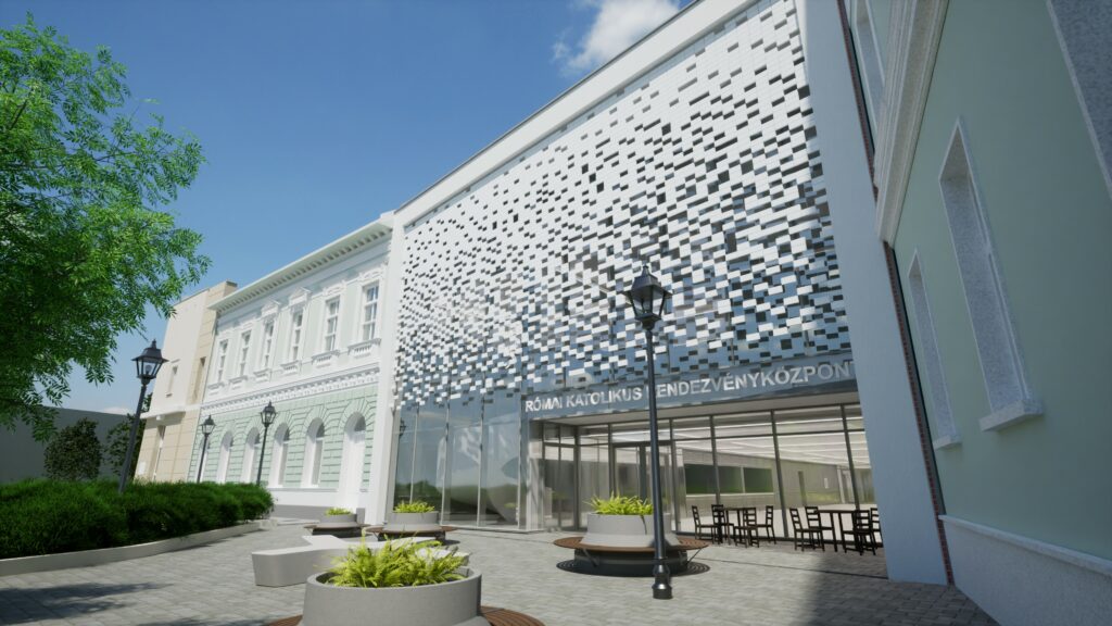 A Római Katolikus Rendezvényközpont teljes hasznos alapterülete: 1412,59 m2. Az épület négyszintes kialakítású lesz. A földszinten kap helyet a rendezvényeket kiszolgáló kávézó, ruhatár, központi vizesblokk, raktár, valamint egy multifunkciós átfolyó tér, amelyet mobilfalakkal kisebb terekre lehet majd bontani. Az I. emeleten egy előcsarnokot alakítanak ki, amely a nagy előadóhoz kapcsolódik. Az előadótér felülvilágítókon keresztül jut majd természetes fényforráshoz. Továbbá ezen a szinten kerül elhelyezésre a tálalókonyha is. A II. emeletre kerülnek az öltöző blokkok, a tetőtérben pedig a gépészet helyét, valamint a raktárt alakítják ki.
