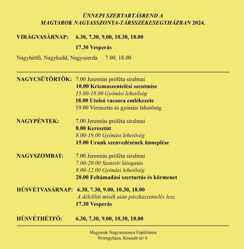 ÜNNEPI SZERTARTÁSREND A MAGYAROK NAGYASSZONYA-TÁRSSZÉKESEGYHÁZBAN 2024.