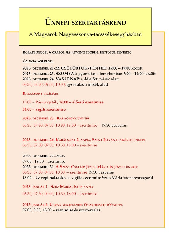 Ünnepi szertartásrend a Nyíregyházi Magyarok Nagyasszonya-társszékesegyházban